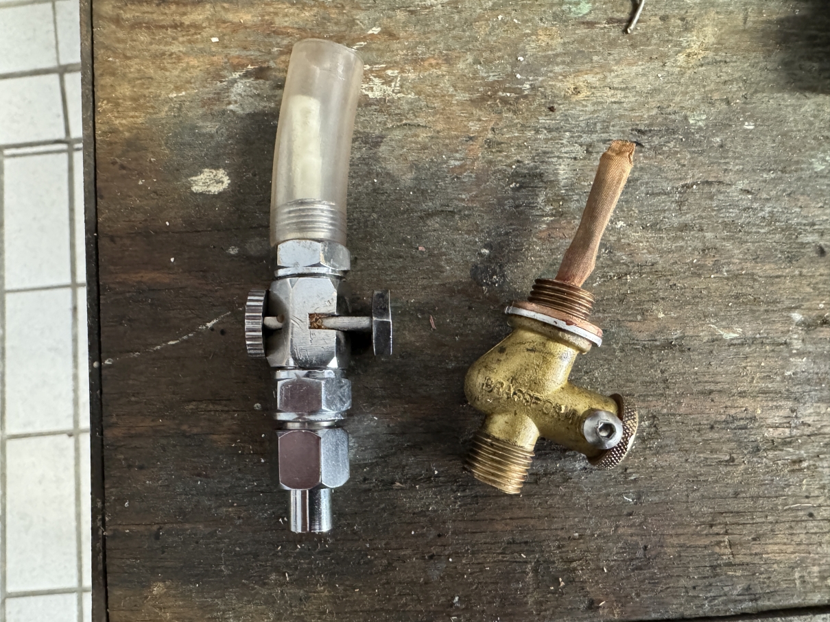 23.08.2025 - In letzter Zeit macht die Enfield leider wieder Zicken: Sie knallt und ist nur sehr schwer in Gang zu bringen. Das Problem ist schnell gefunden und behoben, da lediglich der Zündzeitpunkt reichlich danben war und sich auch mit dem Handverstellung am Lenker in akzeptable Bereiche bringen ließ. Unschön dagegen sind zwei andere Probleme: Es ist wieder einmal einer der beiden "Push- Pull" Benzinhähne undicht, in D kosten die Dinger trotz zweifelhafter Qualität gut 60 Euro das Stück, in Indien dagegen nur die Hälfte - und die in D angebotenen Exemplare werden ebenfalls dort hergestellt. Also bestelle ich 2 Stück in Indien, das dauert natürlich ein paar Wochen. Als die Teile eintreffen, mache ich mich sogleich an die Arbeit. Mit einer elektrischen Pumpe wird der Sprit abgesaugt, dann der linke Hahn abmontiert. Leider ist einer der neuen Hähne sofort undicht, der andere macht einen besseren Eindruck - zumindest auf Anhieb. Bei der Probefahrt zeigt sich aber noch ein anderes Problem: Links hinter dem Primär- deckel tropft massiv Motoröl heraus! Ganz dicht ist das zwar nie gewesen, aber so schlimm auch noch nicht. Der zweite Hahn ist auch nicht ganz dicht, ich muß mich nach Alternativen umsehen.